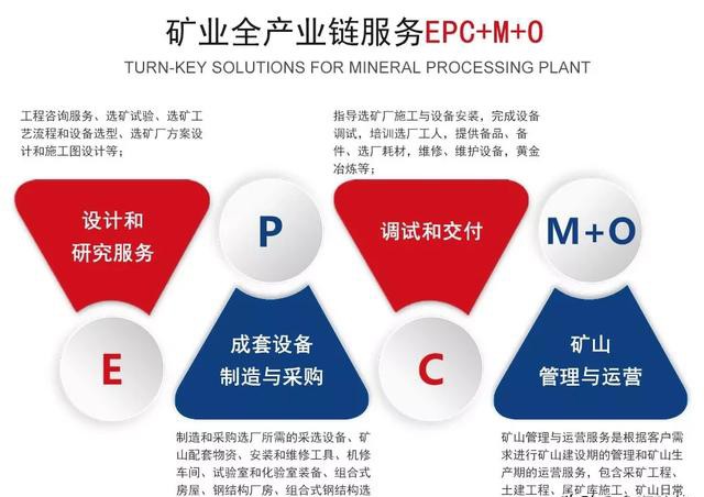 在跨境电商转型过程中,鑫海矿装同时开始自身“制造服务化”转型升级,将主营业务由“单一的矿山机械制造”延伸为“选厂整体服务(EPC)”。2019年,鑫海矿装再次着眼于客户需求,大力整合各个选矿环节,打通矿山行业全产业链条,将自身业务升级为“矿业全产业链服务(EPC+M+O)”,即选矿厂的设计和研究 - 成套设备制造与采购 - 调试和交付 - 矿山管理 – 矿山运营,不仅为客户提供了高效节能的选矿设备,还针对矿山实际提供了创新实用的工艺技术、完备专业的生产线配置及优质贴心的管家式服务。