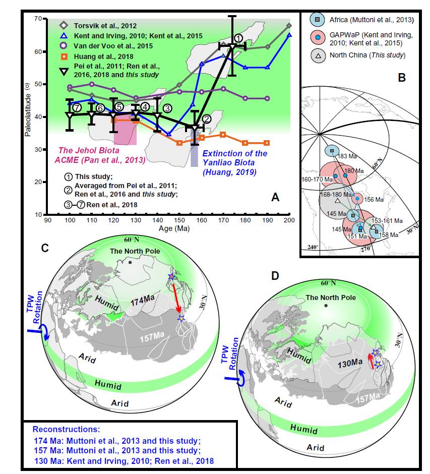 中侏罗至早白垩世期间燕辽地区非常完美地保存了两个生物群的化石,即著名的燕辽生物群和热河生物群,这些生物群的兴衰与燕辽地区古环境变迁密切相关。通过燕辽地区古纬度及古生物演化时间序列对比,该研究进一步认为真极移驱动的环境变迁很可能导致了燕辽生物群在~160-155 Ma的消亡,并为热河生物群在~130-120Ma的重新兴起创造了有利的环境条件(图2A)。
