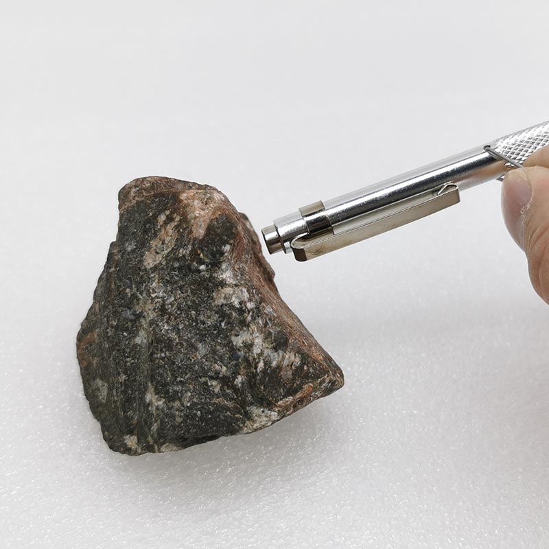 磁性硬度笔是一种设计十分精巧的小型矿石检测工具而且这种工具具有非常之高的性价比,Hiker的磁性硬度笔具备两种功能,其一便是岩石硬度的测量,笔头上搭配了一颗莫氏硬度为9的钨钢笔头,且这种笔头是可替换的,使用者可以使用这种硬度比去测量对应硬度的矿物。其二便是笔尾上有一颗强磁磁钢,这种设计可以便于使用者针对含铁的矿物进行现场快速测量使用,或者使用这块磁钢进行含铁物品的快速分拣等工作。