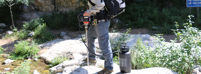 2. 采用汽油动力的小型水泵供水,优点是压力、泵量、泵压大小可调节恒定,动力同样是由主机的二冲程汽油发动机提供。燃油比例为50:1,兼容性好,轻便耐用。完全满足绍尔钻机20米以内的钻进深度要求